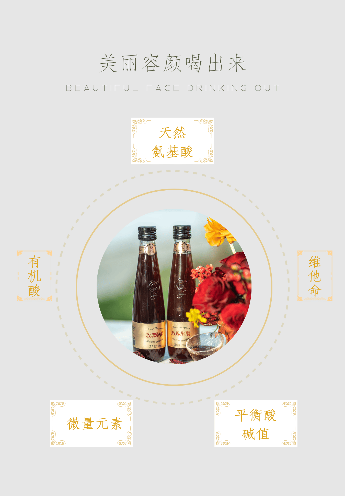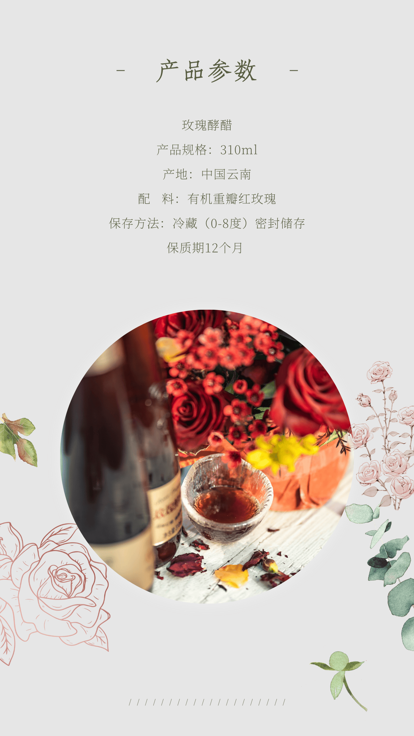 玫瑰酵醋是把有机种植的玫瑰鲜花与米醋用云南大理传统的民间工艺经过300多天自然发酵而成,含有多种微量元素,不添加任何防腐剂、色素、香精,是天然的玫瑰饮品。玫瑰酵醋长期食用可调节肠胃,提高身体免疫力,增强人体新陈代谢。